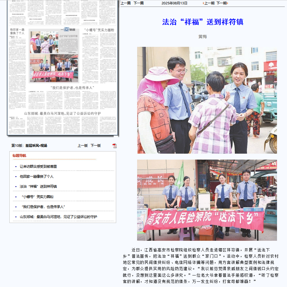 近日,江西省高安市检察院组织检察人员走进辖区祥符镇,开展“送法下乡”普法宣传,把法治“祥福”送到群众“家门口”。活动中,检察人员针对农村地区常见的民间借贷纠纷、电信网络诈骗等问题,用方言讲解典型案例和法律规定,为群众提供实用的风险防范建议。“我以前总觉得亲戚朋友之间借钱口头约定就行,没想到这里面这么多讲究。”一位老大爷拿着普法手册感叹道,“听了检察官的讲解,才知道没有规范的借条,万一发生纠纷,打官司都难赢!”