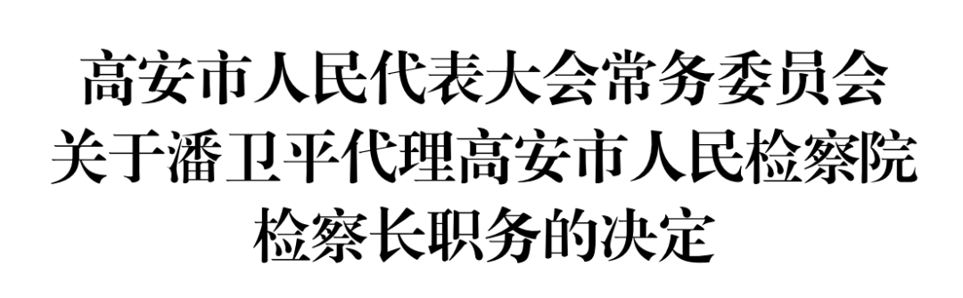 根据地方组织法规定,高安市第七届人民代表大会常务委员会第三十七次会议于2025年12月26日决定:潘卫平代理高安市人民检察院检察长职务。
