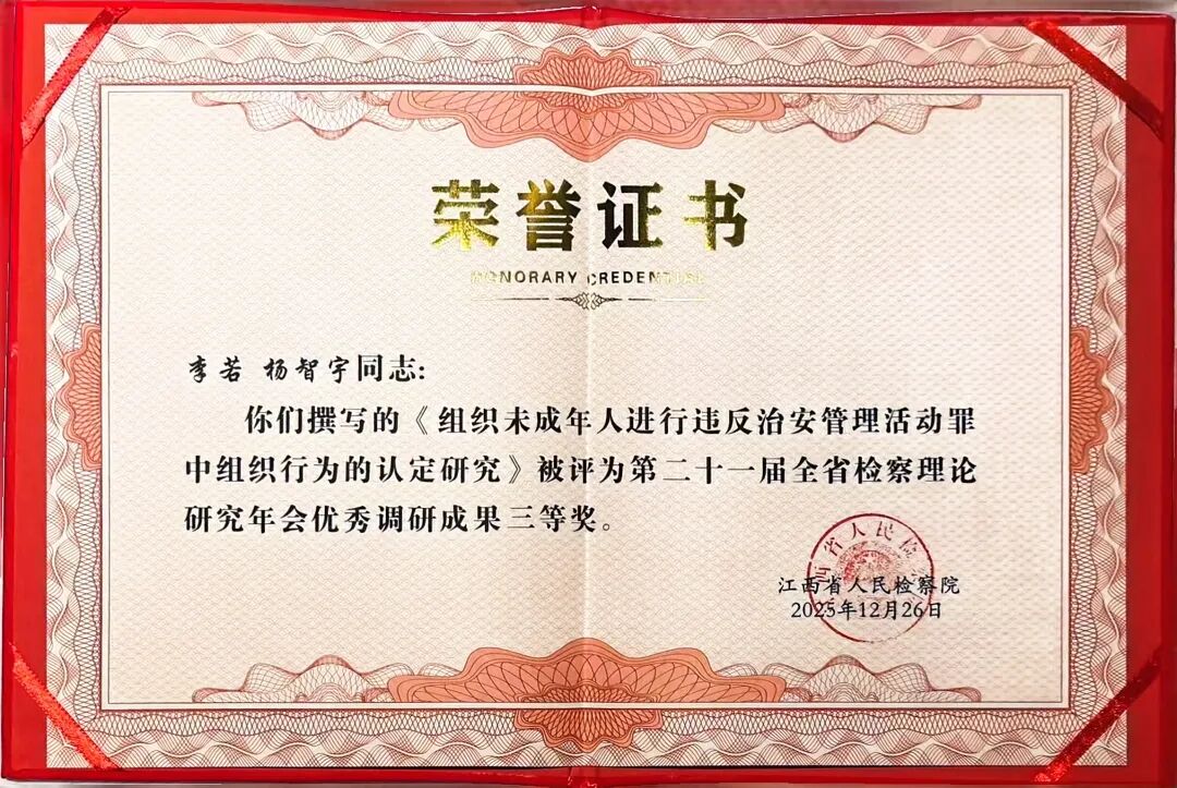 近日,我院干警李若同志撰写的《组织未成年人进行违反治安管理活动罪中组织行为的认定研究》,在第二十一届全省检察理论研究年会中获评“优秀调研成果三等奖”。这份荣誉既是对李若同志专业研究能力的肯定,也彰显了我院在检察理论研究领域的积极探索与成效。