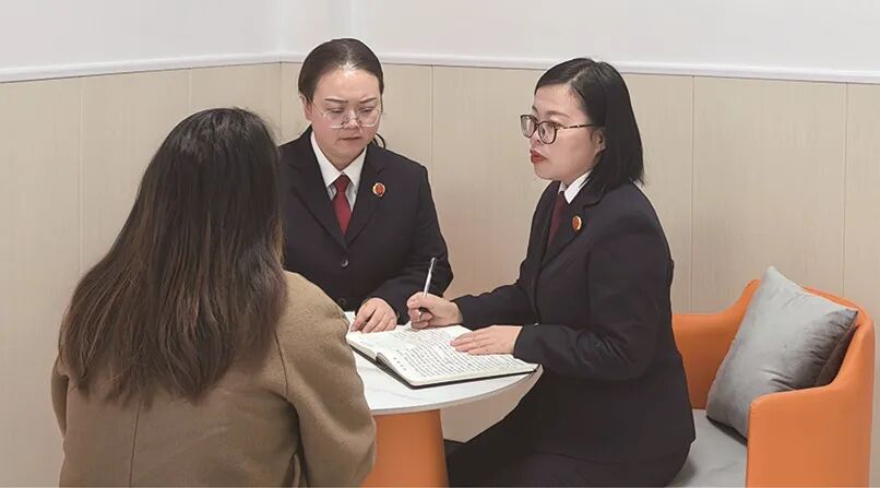 贵州省安顺市平坝区检察院检察官杨晓霞(右一)在接待被家暴妇女。