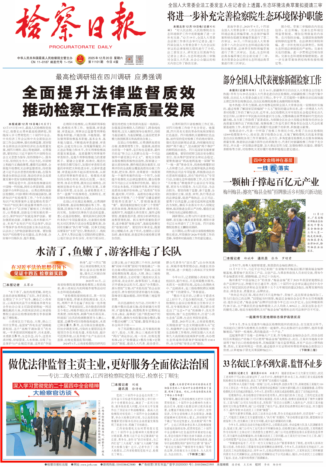 丁顺生:党的二十届四中全会对检察履职寄予更高期望、提出更高要求,职责重大、使命光荣。江西省检察机关将坚持法律监督主责主业、高质效办案本职本源,坚持敢于监督、善于监督、勇于自我监督,更好服务全面依法治国。