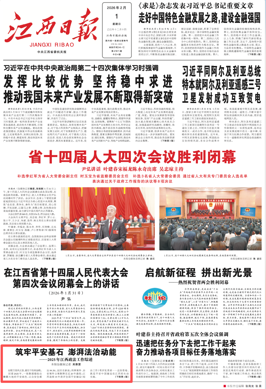 《江西日报》头版报道|?筑牢平安基石 澎湃法治动能——2025年江西政法工作综述