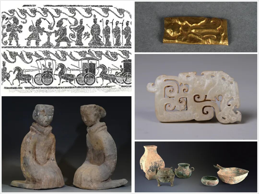 办案中追回的部分文物,从左至右依次为汉画像石、跽坐俑、金饰、鸡心佩(国家二级文物)、青铜器。